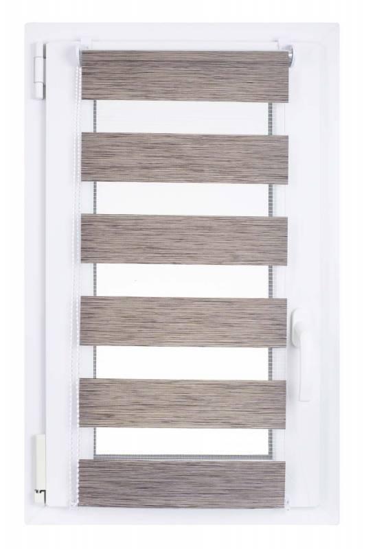 Rolety DEN A NOC jsou elegantním řešením Vašeho soukromí v noci a stíněním ve dne. Rolety vynikají prémiovou kvalitou tkanin a luxusním vzhledem. Rolety fungují na principu dvou překrývajících se vrstev, kde se střídají průhledné a neprůhledné vodorovné pruhy. Platí zde, že čím světlejší barva, tím více světla. Montáž rolety DEN A NOC je velmi jednoduchá, bez potřeby vrtání do rámu okna. Jednoduše se zavěsí na okenní křídlo. V ovládacím mechanismu jsou i otvory pro možnost montáže do zdi, nebo stropu. Ovládání pomocí řetízkového mechanismu se umístí dle potřeby na levou, nebo pravou stranu rolety. Tkaniny v řadě DEN A NOC částečně propouští světlo – nejsou zcela zatemňující.Jak správně změřit ideální rozměr rolety? Změříme výšku okna a na základě naměřené hodnoty vybereme z nabízených výšek 150, nebo 220 cm. Pokud je výška Vašeho okna do 150 cm, pak volíte výšku 150 cm, pokud je výška Vašeho okna od 150 cm do 220 cm, pak volíte výšku 220 cm. Změříme šířku okna – ideální je šířka skla včetně zasklívacích lišt. Ke změřené šířce vybereme nejbližší rozměr z nabídky